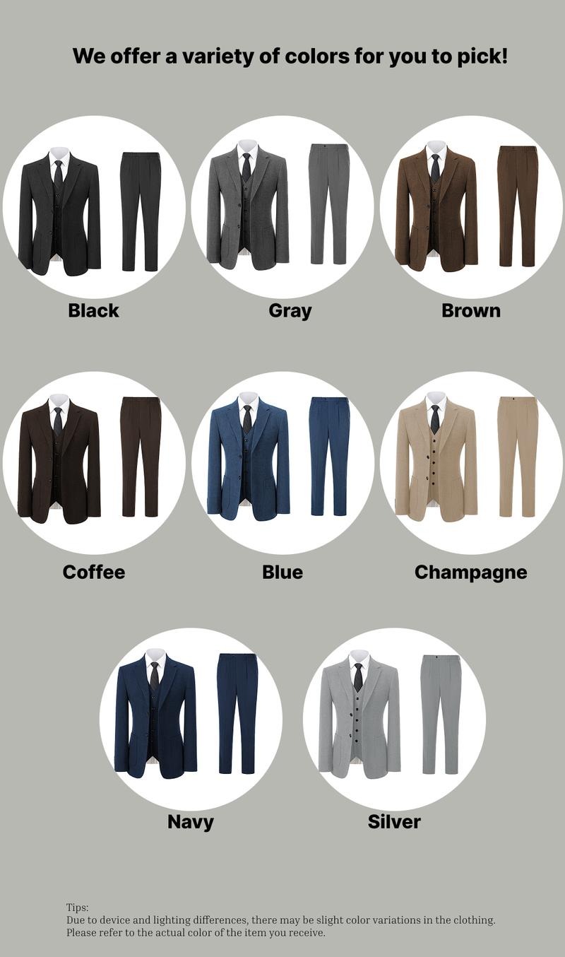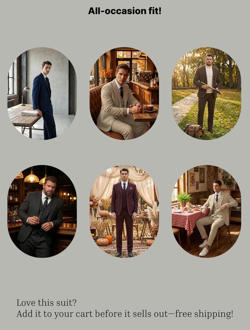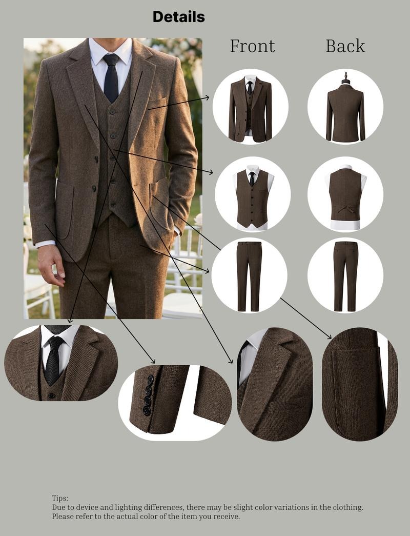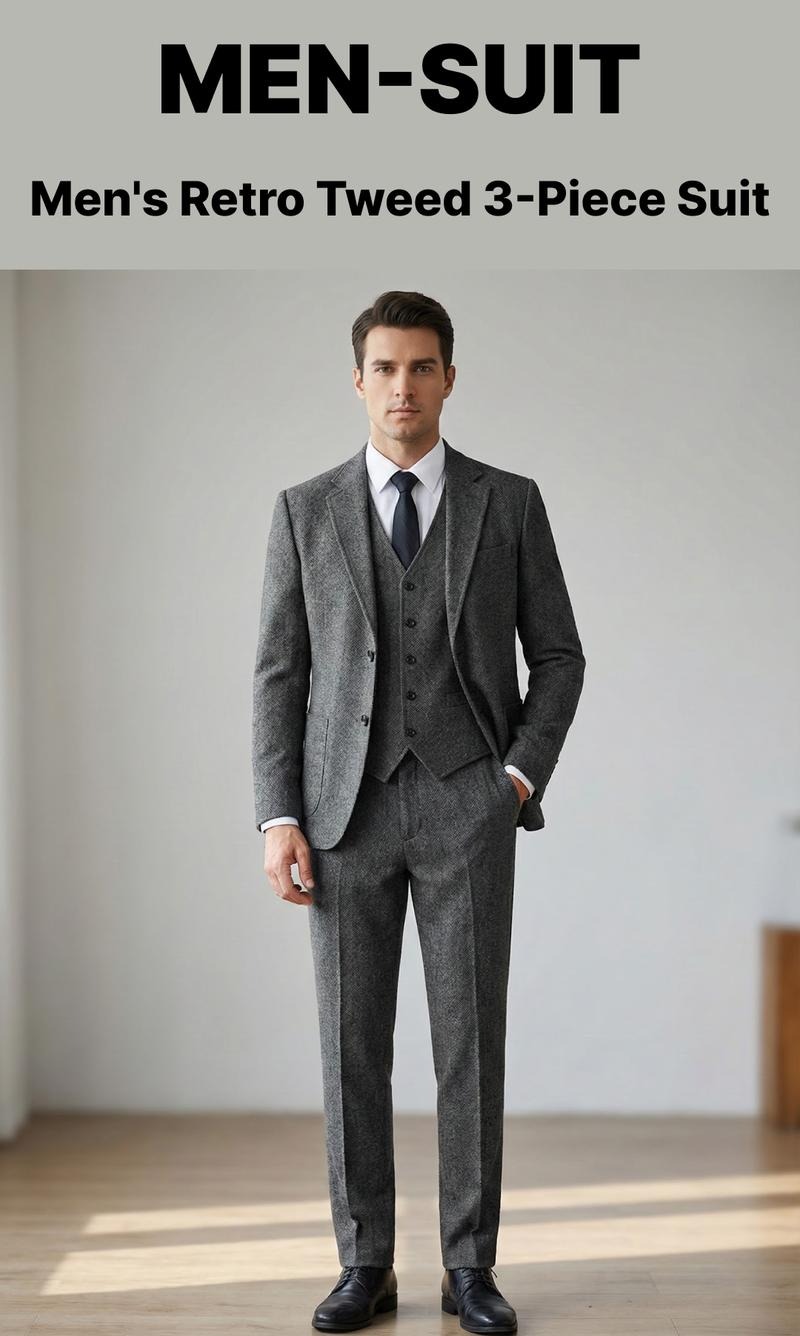 Forget suits that only fit “one occasion”—this 3-piece herringbone tweed set blends old-school sophistication with today’s low-fuss needs. Crafted from a wool-polyester blend, it’s sharp enough for weddings, tough enough for workweeks, and cool enough for weekend dinners.