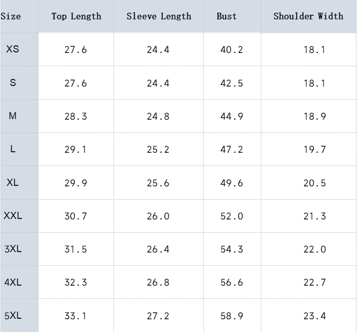 Top Size Chart (in inches)
