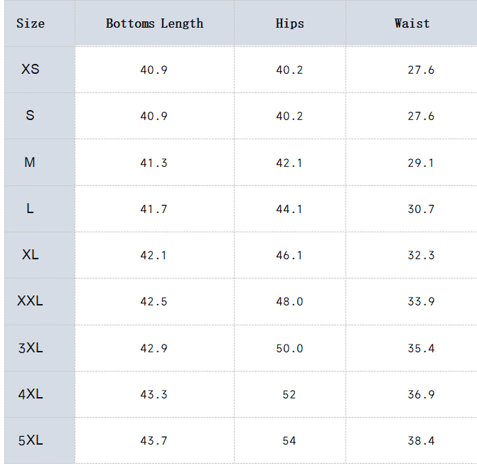 Bottom Size Chart (in inches)